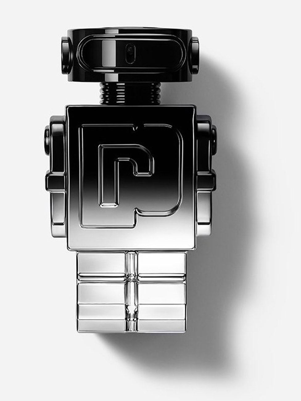 The visual presentation of Phantom Elixir mirrors the contrast within the fragrance itself. The sleek bottle transitions from deep black to metallic silver, representing the meeting of shadows and light. Its glossy finish enhances the futuristic design, continuing the recognizable robot shape that defines the Phantom line. This gradient effect reflects the dynamic energy that inspires the scent, combining bold design with refined craftsmanship.