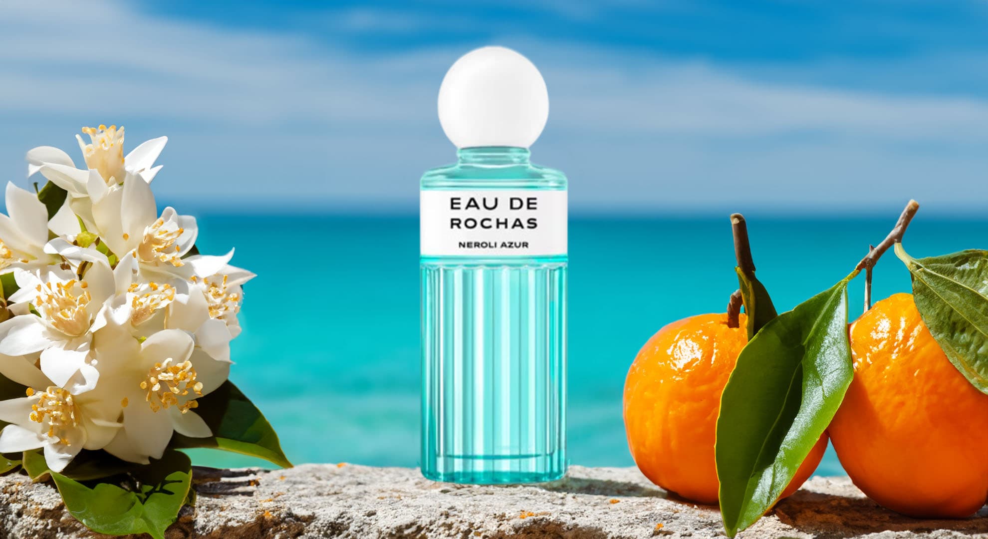 The design of Eau de Rochas Néroli Azur draws on a coastal theme inspired by the Mediterranean. The bottle displays a luminous blue shade that recalls the crystalline waters touching the shore. Its sleek silhouette and refined contours express a modern elegance while staying true to the signature identity of Eau de Rochas. The packaging functions as a vessel and a visual representation of the fragrance’s essence, standing as a symbol of purity, freshness, and lasting style.